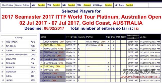2017澳大利亚乒乓球公开赛将于7月2日挥拍开赛,不过今日下午,国际乒联更新了2017澳大利亚公开赛参赛名单,国乒男球员张继科许昕、樊振东、闫安、林高远、梁靖崑6人全部退赛,如此一来,中国队仅参加首届澳大利亚黄金站女子项目比赛。