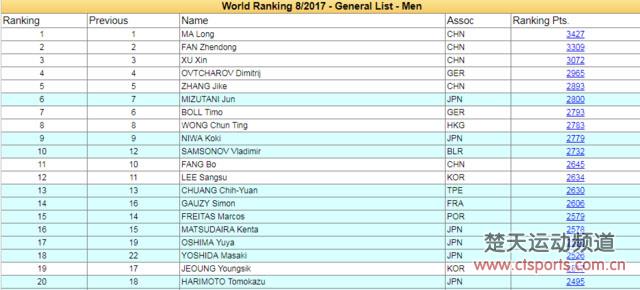 日本选手水谷隼和德国选手波尔排名互换,水谷升至第六,与世界排名第五的张继科,在积分上也有93分的巨大差距。