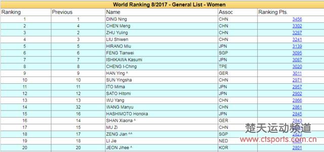 日本17岁小将平野美宇排名第五,她比排名第七的石川佳纯多52分。新加坡老将冯天薇排名第6,德国的韩莹排名第九。