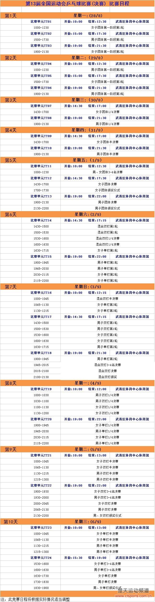 2017全运会乒乓球项目完整赛程