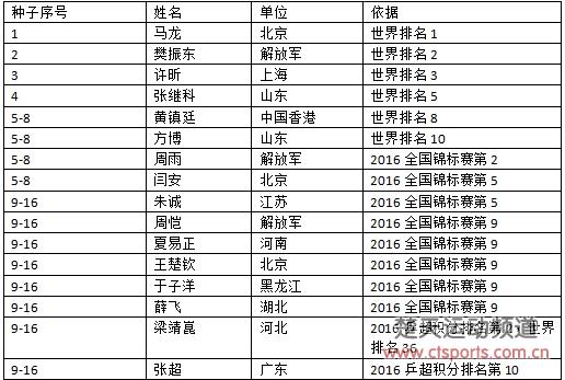 种子确定原则为:国际乒联最新排名前32名运动员(2017.8.1);2017年全国乒乓球锦标赛前16名运动员;2017年乒超联赛个人积分排名前10名。