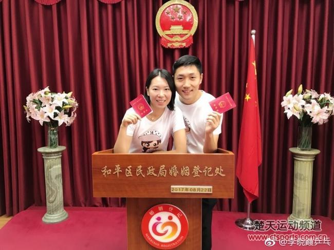 李晓霞在微博中晒出领证照片,并写道:"2017年8月22日,我们领证了,我的人生多了一个本,我的生活多了一个他。过去的二十几年有乒乓为伴,而未来的几十年,有他风雨相伴。我是幸福的,我们会一直幸福!"