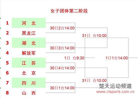 最终北京、解放军、河北、黑龙江、湖北、江苏、四川、山西8支队伍挺进1/4决赛。8月30日下午2点,女团第二阶段比赛将全面展开。八支队伍按照小组赛结束后的抽签两两对决,胜者进入四强。河北队对阵黑龙江队,湖北队对阵解放军队,江苏队对阵丁宁领衔的北京队,四川队对阵上一届全运会亚军山西队。女团冠军将在9月1日产生。