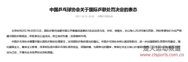 对于国际乒联对马龙、许昕、樊振东三名运动员无理由退出2017中国乒乓球公开赛,处以每人20,000美金罚款一事,中国乒协表示:“会进一步加强国家队思想作风建设,强化爱国主义、集体主义教育。”
