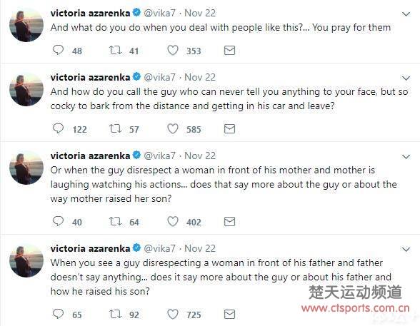 当地时间11月22日,阿扎伦卡在官推上突然对前男友的父母进行了强烈批评。她写道:“当你们看到一个家伙在他父亲面前不尊重女性、而他父亲却什么都没说……这是否说明了这个家伙或者他的父亲教育儿子的方式?”
