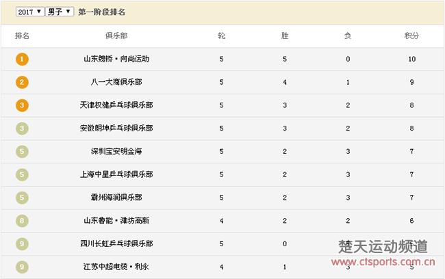 2017乒超联赛第五轮比赛正在进行中,今年的乒超联赛更改了规则,只剩下常规循环赛,最终俱乐部排名以循环赛积分为准。截至目前,2017乒超联赛男团第五轮比赛结束,山东魏桥排名第一,八一大商第二,天津权健第三。