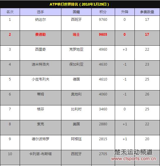 2018澳大利亚网球公开赛随着瑞士天王费德勒卫冕夺冠而宣告结束,不过拿到第二十个大满贯冠军的费天王,并没能一举坐上男子网球世界第一之位,根据最新一期的ATP世界排名积分榜来看,费德勒仅落后纳达尔155分。
