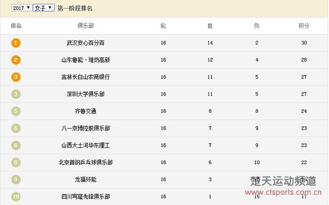 乒坛快讯-2017-2018乒超联赛已经前16轮比赛已经全部结束,根据本届乒超联赛比赛规则,只有18轮常规赛,常规赛结束后根据积分排名。目前,排在女子俱乐部榜首的是上届冠军武汉安心百分百队,战绩为14胜2负。第二名是山东鲁能俱乐部,战绩为12胜4负。如此看来,武汉安心百分百俱乐部基本已经锁定2017-2018乒超联赛女团冠军之位。