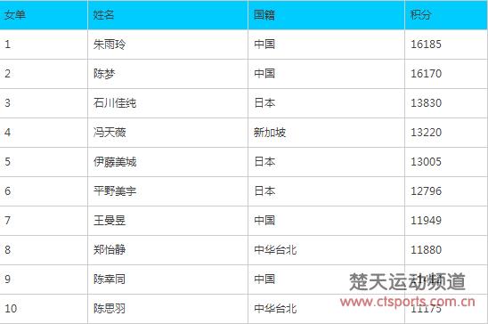 新加坡名将冯天薇排名第四。伊藤美城和平野美宇分列第五和第六,小将王曼昱第七。中华台北的郑怡静第八,中国小将陈幸同升至第九,中华台北的陈思羽排名第十。大满贯得主丁宁位居第14,刘诗雯排在第20,顾玉婷和孙颖莎分列第26和第34。