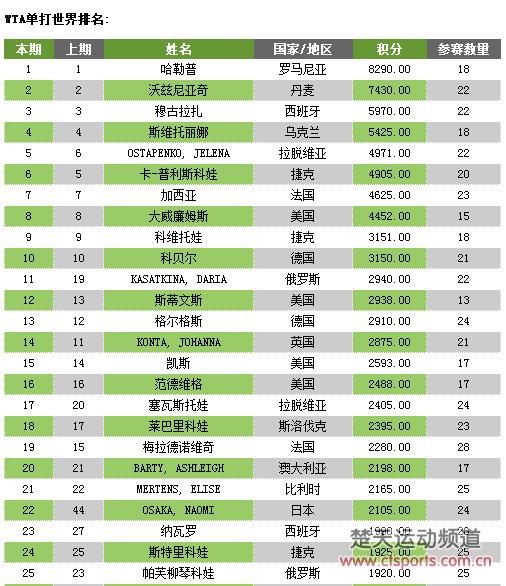 世界前四不变,依旧是哈勒普、沃兹尼亚奇、穆古拉扎和斯维托丽娜,第五名变成前法网冠军奥斯塔彭科。