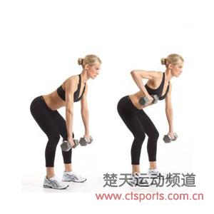 左右手分别持一对哑铃(或者任何适宜单手抓的重物亦可,例如一瓶矿泉水),双脚分开与肩部同宽,膝盖微曲,背部保持正常形状,尽量下压到接近与地面平行的位置。同时,双手持哑铃下垂,依靠手臂力量将一侧的哑铃提起,当你放下这一侧哑铃时,另一只手提起另一侧的哑铃。交替进行,做6到8次。