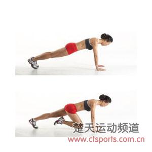 双手撑地俯卧,类似做俯卧撑的动作,保持身体从头到脚自然挺直,右脚离地屈膝朝胸部抬起,到达上限后停顿几秒,再恢复原来的姿势。换左脚做同一动作,左右脚各做10次。