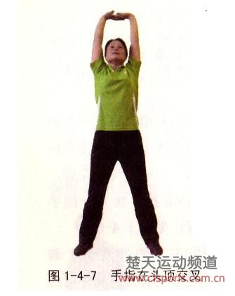 直立,双手手指在头顶交叉,掌心朝上。双臂尽量向上、向后伸展,保持2×8拍。放松后,反复做几次,见图1-4-7。
