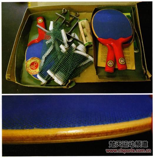 这一套W8型号是老Wilson中的老大哥,约生产于40年代。和当时流行的乒乓球板套装一样,附有球网、球和球例(规则)。以砂纸为覆盖物,是带有大芯的硬三夹板结构,和以后的三夹老Wilson大为不同。收藏这盒球板时我有个教训,打开盒子时,我的手开始红肿,而且多日不退,最终去看医生,医生说是给一些不知名的小东西咬到了。从此,每当得到一些很老的球板时,我都会戴上口罩和医用手套来保护自己。