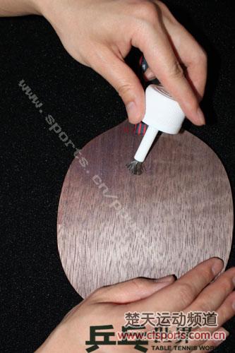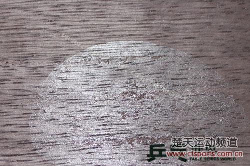拉丝和掉屑对球板的摧毁力也不小,严重时可完全破坏面材结构。笔者推荐使用护木液,便捷高效,有技术含量。需要注意的是,涂刷的时候一定要薄,小刷子蘸满液体后要在瓶壁上多刮几下,使附着的液体尽量少,然后快速刷在板面上。蘸一次要刷尽量大的面积,一面板面用四刷子左右即可涂满,量已足够。液体干后会留下透明的硬质膜层,一方面加固了木材,另一方面使得板面光滑。刷多的话会有明显副作用,太光滑贴不上胶皮、太硬改变了球板性能,这并不是护木液不好,而是涂刷不当,过犹不及。只要涂刷量控制得好,对性能是不会产生影响的,严谨一点说,会对性能产生可以忽略不计的影响。涂前可别忘了,清理掉残余的毛刺,不然都会被固定到板面上,不平整。