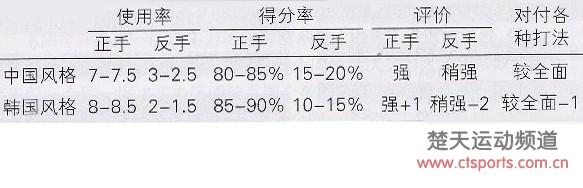 如果有人一定要问,这两种风格哪种更好些,我们不妨分析一下二者的各自特点。中国风格强调正手进攻,突出正手杀伤力,同时辅以反手进攻,全台兼顾,攻防稳固,可对付左右手各类打法,有横板的优势,又不失直板的灵活。但有时倚重反手较多时,就会忽略正手的进攻;韩国风格更强调正手的全台搏杀,有强大的杀伤力。但反手进攻力较弱,易生成空当受制约,不能全面应对各种打法,对左手横板带生胶的打法就比较难对付,如金择洙屡屡负于王涛就是一例。下面用表格来表示一下两种风格,其中内容仅是感觉上的结果,而非统计结果。