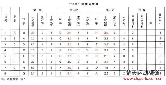 再以上表为例:三轮比赛后,全胜的只有一队-A队,是当然的第一名。只负一场且积分为5的队是:C队、D队和H队,他们是笫二名到第四名的获得队。通过计算本方名次和,确定了第二名是H队(名次和为4,即最后一轮败者)、第三名是D队(名次和为5,即第二轮败者),第四名是H队(名次和为6,即第一轮败者)。E队、G队、F队分别是第六名、第六名和第七名。