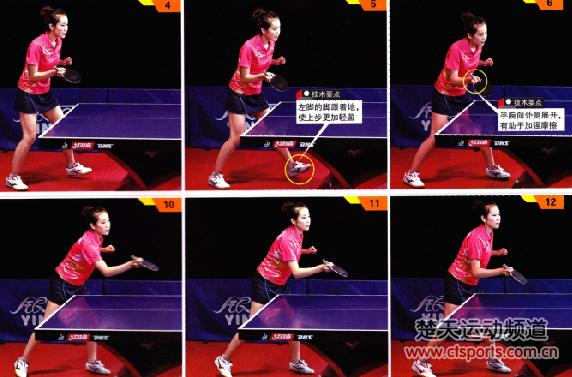 图1-6中,芦璐侧身时,左脚向左前方跨出一步,重心十分平稳。图5中,她的左脚以脚跟着地,这种方式可以保证上步十分轻盈,身体重心不会出现过度的晃动。图6中,芦璐的上半身稍稍压向台面,使重心的高度降低。在这一部分的连续图中,芦璐的引拍动作并不是很明显,几乎没有出现向后“拉手”的动作,她的大臂自然贴近身体,前臂端起来,使球拍始终处于台面的上方,她通过上步以及上半身下压,尽量使身体接近来球。在图5-6中有一个细节需要注意:第一,芦璐的在击球之前,她的手腕稍稍向外侧转动,虽然手腕转动的幅度很小,但却可以在击球时增强摩擦,还可以利用手腕的力量控制弧线的长度。