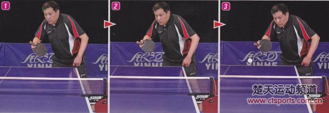 站位:从图中我们可以看到,潘强在准备接发球时的站位偏于反手位。实际上,作为一名长胶打法的选手,尤其是一名直板选手。在接发球的站位_二.更要选择在中间稍稍偏反手位的位置上,因为这样有利于更全面地照顾到正反手的来球。如果此时我们的站位像反胶选手一样偏于反手位,那么一旦对手发我们正手位的急长球,即使可以利用步法调整到位,但由于长胶与反胶的性能差别较大,直接抢攻的机会也会很小,而勉强接过去的球也不能给对手制造衔接上的困难。所以为了能在最恰当的时机将长胶的特性施加于球上,我们要在接发球时更加注重全台的落点。图中,潘强站于偏反手位只是为了更好地拍摄接发球的动作,实际上图1=中的位置应该是他在原始站位的基础上向左平移之后的效果。击球时注意的环节