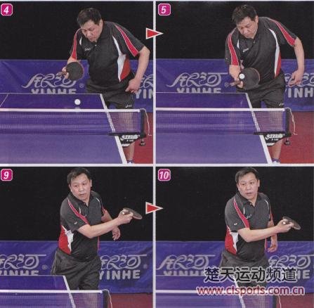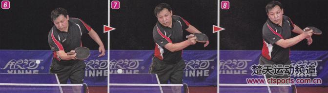 发力:从图5中,我们可以看到,潘强抓住了来球的上升初期进行击球,这是大家在平时的实战中要特别注意的。因为“侧挤”动作最关键的就是要充分借上来球的力量和旋转通过瞬间摩擦将球挤出去,而处在上升最高点的球,其力量和旋转是最强的,所以选择上升初期是我们合力击球的最佳时机。