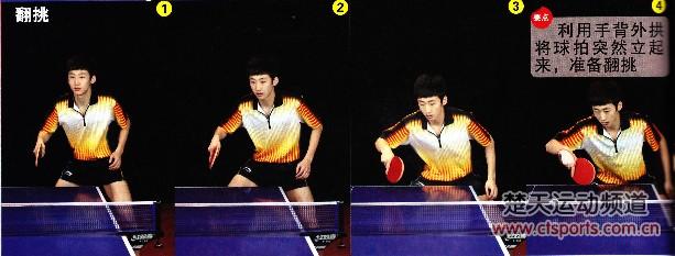 利用手背外拱将球拍突然立起来,准备翻挑。
