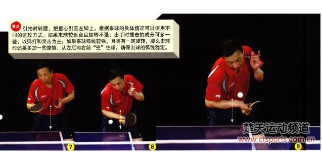 引拍时转腰,把重心引至左脚上,根据来球的具体情况可以使用不同的进攻方式。如果来球较近台且旋转不强,出手时撞击的成分可多一些,以弹打和突击为主;如果来球弧线较强,且具有一定旋转,那么击球