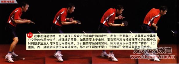 在中近台进攻时,为了确保正胶攻击的准确性和速度性,发力一定要集中,尤其要以身体重心交换的作用为依托,增强球的质量。如果需要上步击球,要在预判对方接发球落点的过程中及时调整步法及人与球台之间的距离,为引拍击球预留出空间。因为使用反手进攻的“蓄势”十分重要,而一旦被来球顶住或离球太远,那么对于调整手型打“过渡球”会造成非常大的难度。
