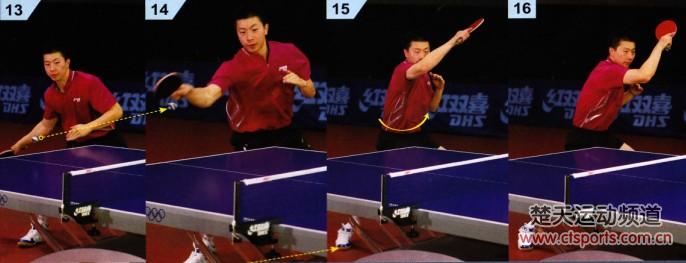 13-16:马龙在衔接第二板进攻时选择了击打来球的上升初期,可令对方难于从容防守:而且通过转腰的幅度及右脚脚尖儿指向的变化,可以说明马龙的攻击动作完成得十分到位,充分体现了其“速度快,衔接好”的优势。