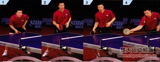 1-4:接发球时,左脚要先垫一步(包括原地垫步),右脚上步取位准确后,要在台下踩实后再击球,这样出球更有质量。这种步法可以通过重心转换为击球提供更充分的准备,同时也能够减少在预判不准的情况下调节动作的风险。