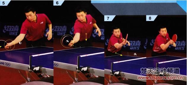 5-8:在准确判断出对方发球的旋转后,利用手腕突然转换拍形,同时略微抬高身体重心,以形成 “自上而下”的攻击态势。对于大多带有侧旋或侧上旋的发球,击球时拍形要稍微前倾,并通过身体重心的前压控制出球弧线。此外,手臂与手腕的动作要稳定,以身体的带动发力为主。