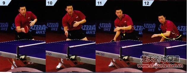 9-12:在衔接下一扳抢攻时,马龙采取了“一步撤”的步法,即右脚蹬地迅速后撤,左脚同时向左迈出,瞬间拉开两脚之间的距离,为支撑身体重心!引拍击球做充分准备。