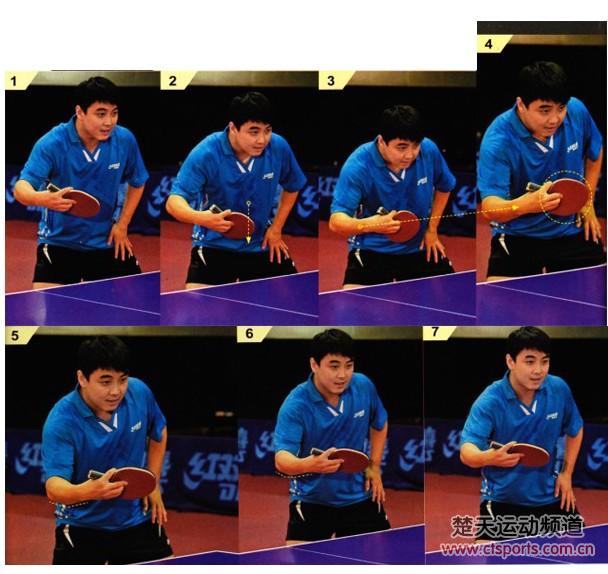 1-7:虽然防守弧圉球主要以借力为主,但击球前的小幅引拍动作不能忽略,还是要力争迎球击打。在击球时,手臂与手腕的动作要保持稳定,拍形要相对打得比较开,不能过于前压。这样不仅更容易借上来球的力,而且可以保证充分的触球角度和吃球面积,从而更有利于控制出球线。