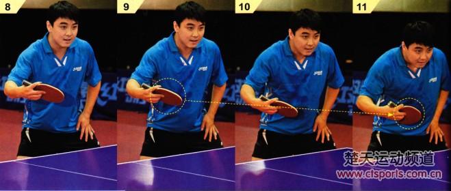8-11:在一板防守之后,身体重心要迅速还原到两腿之间。肩部及手臂要自然放松,不能“架”起来使上身越来越僵硬。同时紧盯对手的下一板进攻,顺势引拍,调整拍形,进行连续防守。
