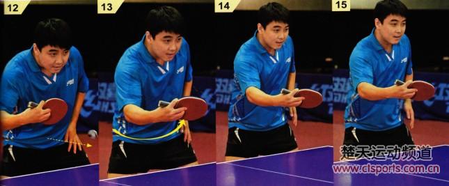 12-15:在防守中准备变线时一定要利用身体重心的作用。王皓在第一板防斜线接第二板防直线时,通过腰部转动对回球弧线的控制非常明显。在这个过程中,身体重心的转移对来球的缓冲有非常重要的作用,它会降低控制球的难度,使变线的命中率更高。