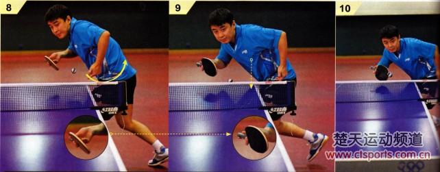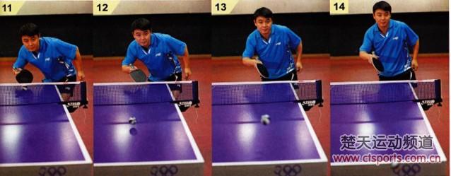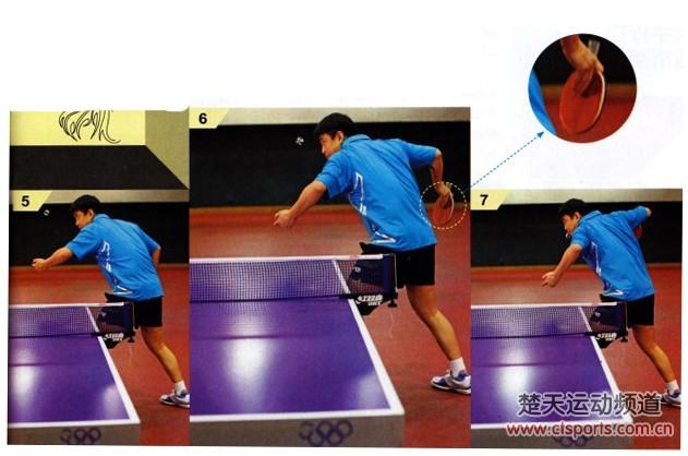 8-14:为了能够充分摩擦球,击球时要利用食指把拍形“抠”得比较平;拇指需要顶住拍肩部位,发力压住球拍;后面三指要起到稳定拍形的作用。这样才能发出力来,为出球制造更强的旋转。