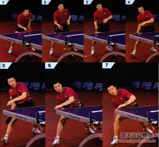 1-7:由于横向移动的范围较大,所以脚下垫步要迅速移动保证精确的取位击球。引拍时,肩膀及重心要充分下沉。手臂的大幅度下摆有利于拉大击球距离,保证击球实效。