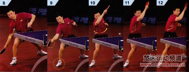 8-12:马龙拉了一板斜线球。这板球的出球速度不要求快,反而是越慢越好,击球时间可以等到球的下降期,关键是要充分摩擦,制造弧线。击球时,右脚要踩住地,给身体足够的支撑,触球部位尽量在球体水平中心线的偏下位置。拍形要根据来球的旋转调整到一个合适的角度,不能过压或过亮,避免摩擦不充分。拉斜线时,配合身体的转腰动作,也可以拉出角度很大的球。
