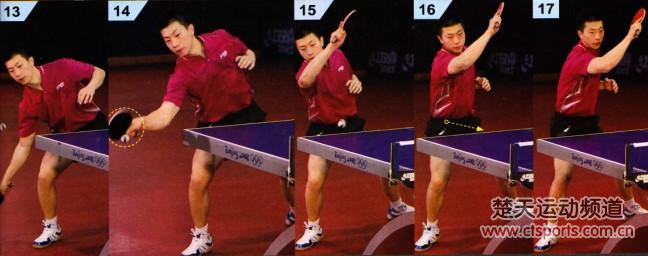 13-17:马龙拉了一板直线球。与拉斜线不同的是,拉直线球的动作速率可以放得再慢一些,击球时间可以更晚一点。因为如果“抢点”的话,对于出球线路较短的直线来说,控制弧线稳定性的难度非常大。从拍形来看,拉直线时比拉斜线时可以打得略开一些,但仍要以保证充分的摩擦为前提。击球时,转腰的幅度不如拉斜线时大,但手臂与身体重心的配合同样要求协调一致,前臂与大臂、大臂与身体都不能出现脱节的现象。除了强化向上发力之外,还要着重体会吃住球后向前发力的感觉。