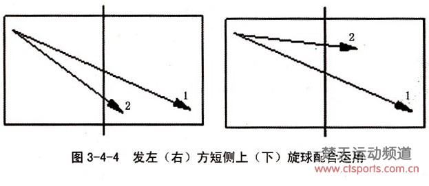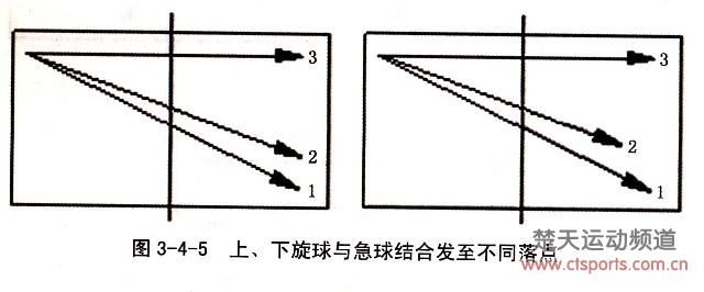 ②上、下旋球与急球结合发至不同落点。发侧上或侧下旋球与急球结合至不同落点,以发侧上或侧下为主配合发右角急球,发正手右大角急球配合左大角急球,伺机抢攻,图3-4-5。