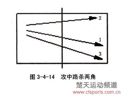 ①攻中路杀两角。此战术用以对付两面攻或横拍反手攻较强的对手。这类打法的运动员往往是反手进攻技术好、正手相对较弱'中路更是其弱点中之弱点。可先用推挡或反手攻压住对方的中路或正手,伺机杀反手,见图3-4-14。