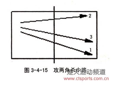 ②攻两角杀中路。此战术用以对付对方两面攻或横拍左右两面都不怎么凶狠的选手,而自己的反手相持能力较强,正手攻击力较凶狠使用,见图3-4-15。