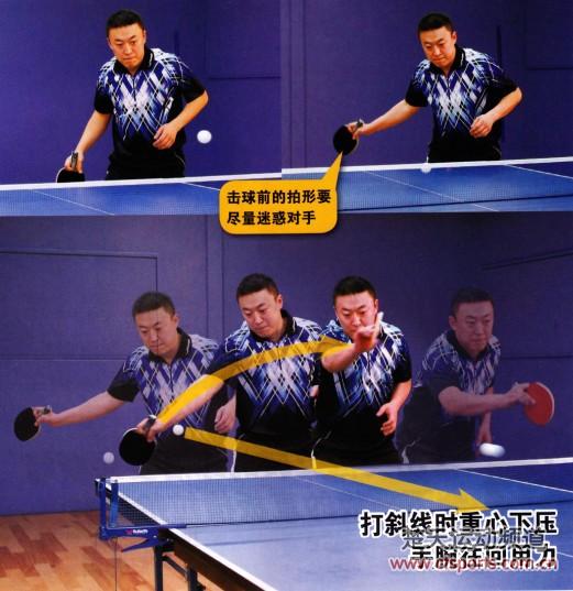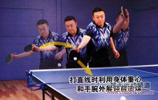 本组技术图是正手台内打斜线和打直线的进攻图。击球前不能让对方看出自己要打的线路。击球时,手指和手腕用力并快速挥拍。用手腕回转的动作去打斜线,或者身体用力向前迎球去打直线,这是两条线路的动作区分之处。