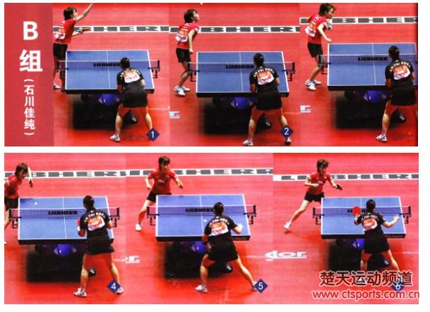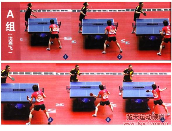 使用正胶的技术动作强调的是突然性,而反胶的技术动作更多是靠腰和腿的配合发力及手法控制。沈燕飞和石川佳纯在这两套图中都使用正手侧身抢拉的战术,但在整体技术动作运用的远离上,还是存在很大差别的。