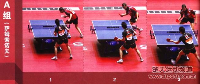 图B7-8中,萨姆索诺夫在二、四板衔接时电采用了同样的站位方法,但和水谷隼稍有不同。萨姆索诺夫身高臂长占有优势,反手位的护台范围更大,所以取位的时候比水谷隼更靠近球台的中间,这样在左手和右手对峙中,能更好地保护自己正手的空当。