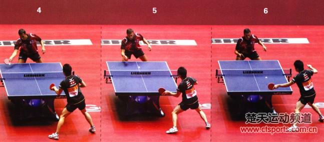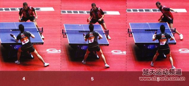 图3—5分别是两人发球后还原的站位。两人都靠近反手位站,并且持拍手一侧的腿都更靠后。这种站位有利于侧身进攻,所以中路的漏洞就能通过步法的积极调整去弥补。’