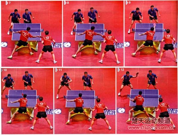 本组图中的前三板是中规中矩的技战术套路,也是典型的双打战术。许听发球后,马琳摆短到王励勤的正手位,王励勤抢挑。发球和接发球需要严密的控制与反控制,由于比赛中任何一板进攻都能成为最后的致命一击,所以哪方能抢先进攻,哪方就占据了主动。
