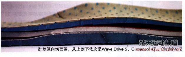 在鞋垫与鞋底之间,Climacool 4T用一层较薄的布垫缝制各种透气网,与鞋底EVA等材料分隔开,并无其他夹层。Wave Drive 5有一层绒毛状的夹层,底面与鞋底交界处是胶合的纤维织布,厚度在1.5毫米左右。Bladelyte 2则是垫下还有垫,原本鞋垫就是最厚,又来个厚度2.5毫米左右的海绵垫,难怪亚瑟士对自己球鞋的减震性极有信心,号称缓震一流了。