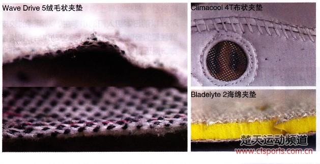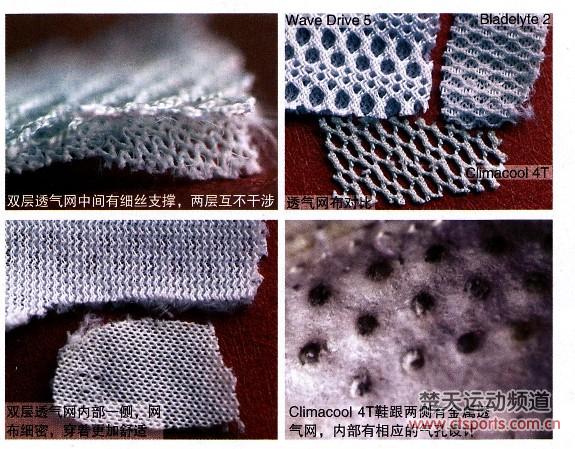 鞋面在牢固、美观的同时,另一个重要任务就是“散热透气”,这是网面的本职。美津浓没有在透气性上标新立异,很少强调相关技术,在出汗多的部位使用网面,设计中规中矩,Wave Drive 5网面就是这样,双层结构,外孔大、内孔小。亚瑟士所谓的魔幻透气结构,是鞋面、鞋底、鞋垫等组成的系统。Bladelyte 2的网面与Wave Drive 5较为接近,同为双层结构,只是略薄一些、网眼大小也有异。至于透气性强弱,网布结构差异与使用面积相比,后者才是主要矛盾。对于使用“清风”科技的Climacool 4T,鞋面布满网布,且仅为单层,孔眼又大,透气性高出一截了。