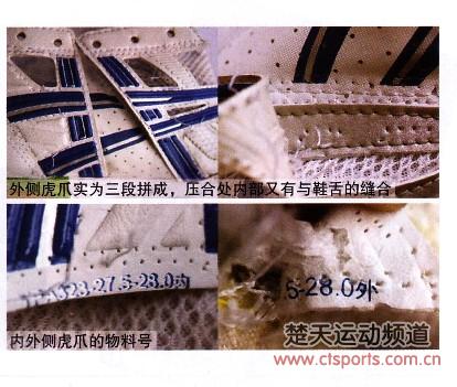 亚瑟士的球鞋外观图案皆成“虎爪”之势,脚的内外侧用料、结构截然不同,Bladelyte 2脚外侧由三部分拼成,重合部位都用双道线缝合,最内层与鞋舌处又有缝合,脚内侧则是一整块材料。由于同为虎爪图案,装配时也许为防出错,内外侧的缝制部分分别标注了球鞋尺寸与用料,可见大厂细节。