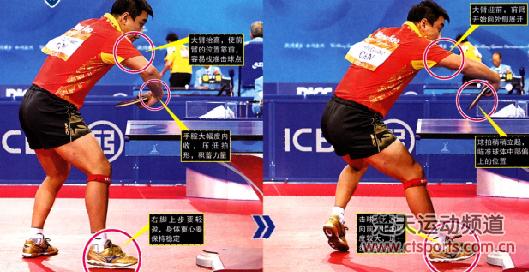 王皓在横拉台内球时,手臂的动作十分明显,但要想充分完成手臂的动作,必须让出足够的击球空间,否则很容易被来球顶住。另外,横拉之后的还原十分重要,必须做好连续进攻的准备,因此远离球台,控制好重心,可以更流畅地进行下一板衔接。